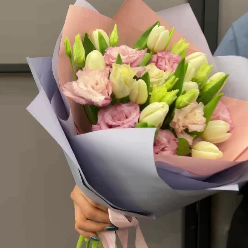 Авторский букет из тюльпанов и эустомы от «FMART x Zvezda».Не забудьте поздравить близких с 8 марта! Подойдёт для любого повода Как ухаживать за цветами? Всё просто:1. Обновите срез букета (секатором или ножом срежьте стебли на 1 см под углом 45 градусов)2. Поставьте цветы в вазу с холодной водой ( предварительно добавив в воду средство для продления жизни срезанных цветов) 3. Меняйте воду в вазе каждый день, а срез обновляйте раз в 1-2 дня.✅ Добавляйте товар и магазин в избранное, чтобы было легче нас найти