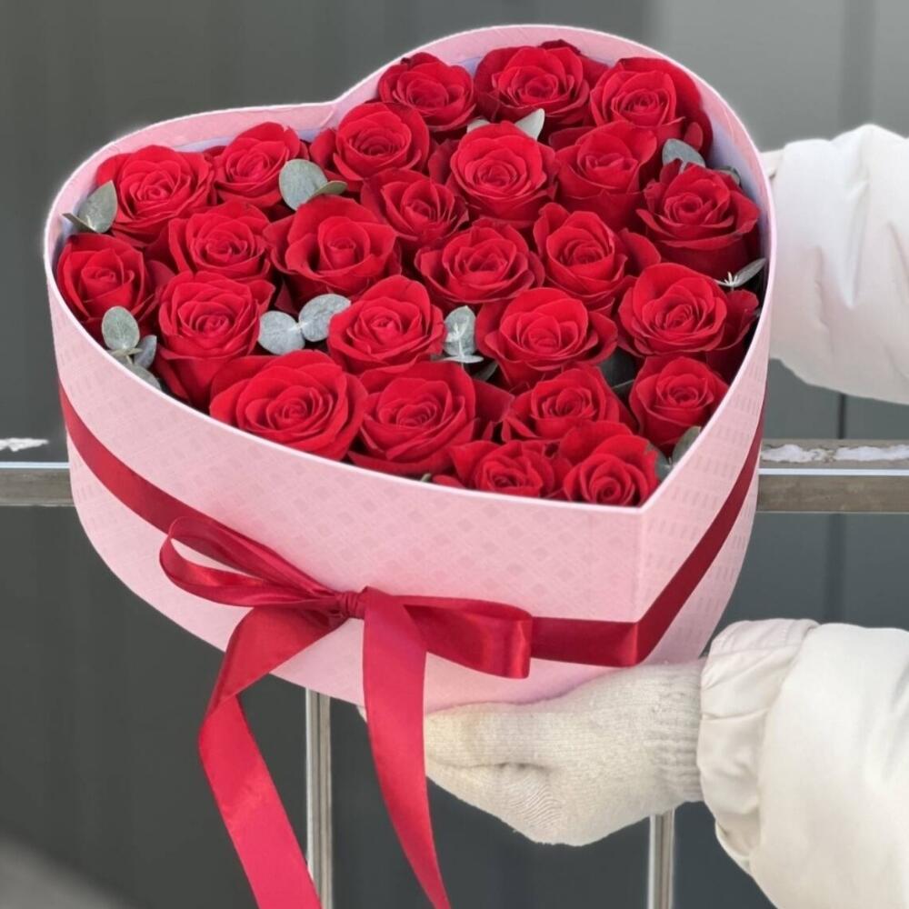 Коробка сердце - 1 шт. Оазис флористический - 2 шт. Эвкалипт - 2 шт. Роза - 25 шт.