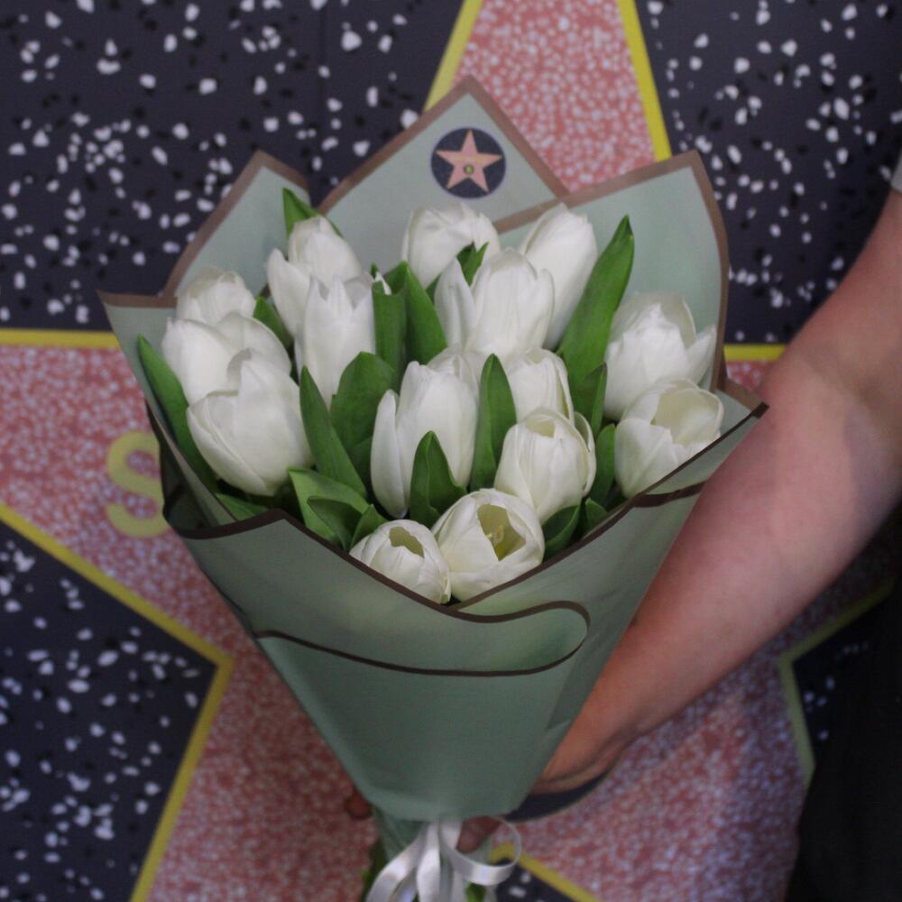 Букет из 15 белых тюльпанов. Тюльпаны голландские. Букет подойдёт для любого мероприятия и торжества. Подарит эмоции и сделает вечер незабываем