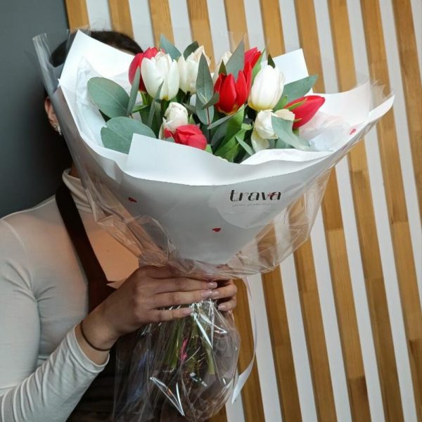 Тюльпан - 13 шт. Эвкалипт - 3 шт. Тишью - 2 шт. Пленка дизайнерская - 1 шт. Дизайнерская упаковка - 1 шт.